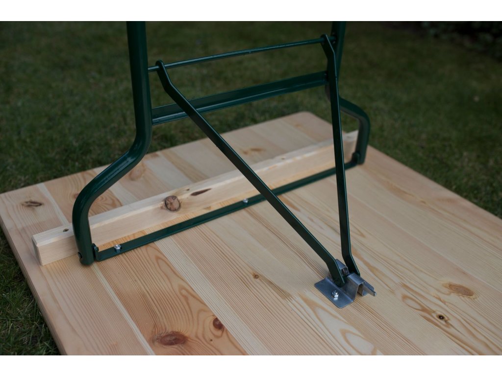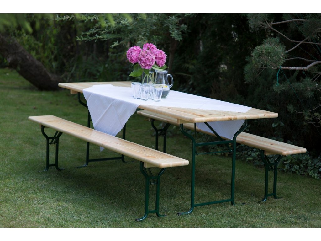 Kvalitní pivní sety z masivního dřeva, vhodné jako zahradní posezení, pro pořádání kulturních nebo gastronomických akcí Rozměry stolu: délka 220cm, šířka 50cm, výška 78cm, síla dřeva 3cm Rozměry lavice: délka 220cm, šířka 25cm, výška 48cm, síla dřeva 3cm Průměr železného rámu a noh 3cm Uvedené rozměry jsou orientační a mohou se lišit +/-3% Rám práškově lakovaný, barva zelená Nábytek je vyrobený z masivního smrkového dřeva Dřevo lakováno ve třech vrstvách čirým dvousložkovým polyuretanovým lakem s tužidlem Rychlé, snadné složení a rozložení - skladné K jednomu pivnímu setu se vejde 8-10 osob Set obsahuje: 2x lavice 1x stůl Certifikace PEFC Naše stoly i lavice mají tloušťku desky 30mm, tzn. vysoká kvalita a odolnost, žádný kompromis! K nákupu 1 ks produktu se vztahuje manipulační poplatek v hodnotě 249 Kč.Dodatočné parametre