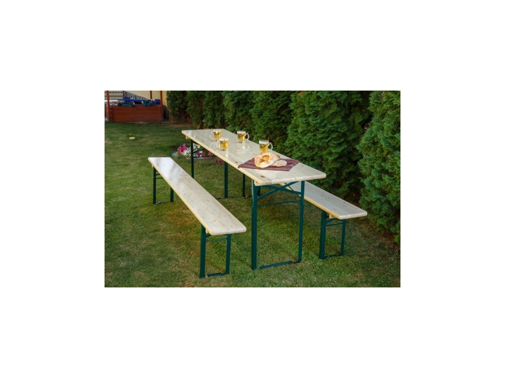 Kvalitní Pivní sety z masivního dřeva, ideální volba pro zahradní posezení, a také skvělé pro pořádání různých kulturních či společenských akcí a setkání s přáteli. Rozměry stolu: délka 220 cm, šířka 50 cm, výška 74 cm, přičemž síla použitého dřeva je 2,9 cm, což zajišťuje stabilitu a dlouhou životnost jednotlivých komponentů. Rozměry lavice: délka 220 cm, šířka 25 cm, výška 47 cm, síla dřeva 2,9 cm, poskytující pohodlí a dostatek prostoru pro sezení. Síla železného rámu a noh je 29x29x2,7 mm, což zaručuje odolnost a robustnost celé konstrukce. Uvedené rozměry jsou orientační a mohou se lišit o +/- 3 %, což je standardní tolerance v nábytkářském průmyslu. Kování je zajištěno pojistnými matkami, které brání samovolnému uvolnění a poskytují další zabezpečení. Dřevo je lakováno ve třech vrstvách čirým dvousložkovým polyuretanovým lakem s tužidlem, což zajišťuje výbornou ochranu proti povětrnostním vlivům a dlouhou trvanlivost povrchu. Set je vyroben z masivního smrkového dřeva. Rám je práškově lakovaný, přičemž barva je v příjemném zeleném odstínu, který se harmonicky hodí do zahradního prostředí. Díky rychlému a snadnému složení a rozložení je set velmi skladný a praktický pro transport a uskladnění. K jednomu pivnímu setu se pohodlně vejde až 6-8 osob, což umožňuje uspořádání různých setkání a společenských akcí. Set obsahuje 2x lavice a 1x stůl, čímž poskytuje kompletní řešení pro posezení s přáteli u dobrého jídla a pití. Certifikace PEFC zaručuje, že dřevo bylo získáno z udržitelných a ekologických zdrojů.Dodatočné parametre